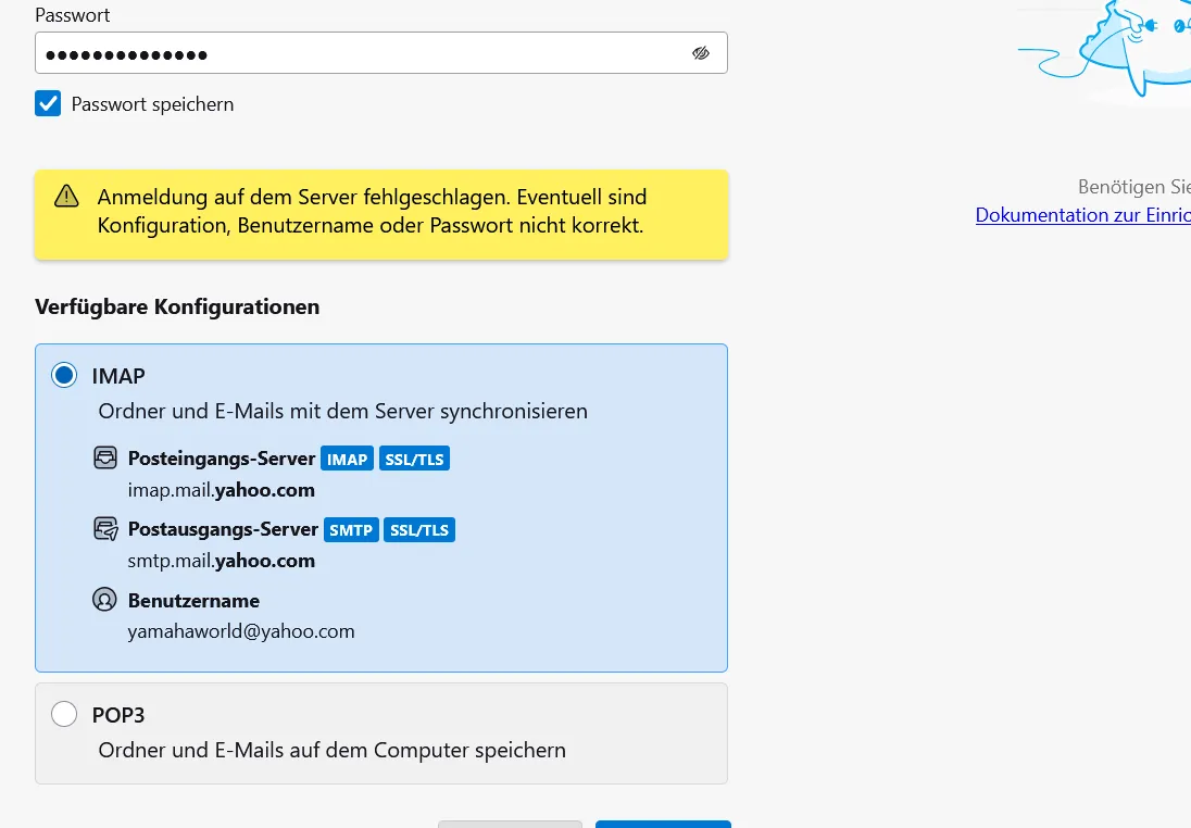 Wenn ich Password normal in den erweiterten Einstellungen auswähle und probiere, erhalte ich "Anmeldung auf dem Server imap.mail.yahoo.com mit Benutzernamen "xxx@yahoo.com" fehlgeschlagen"