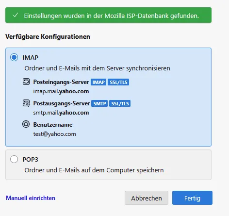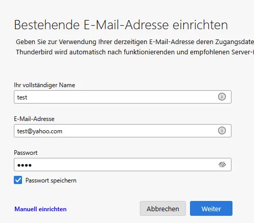 Im Beitrag #29 schrieb ich, dass alles ganz einfach sei. Weitere Versuche in verschiedenen TB-Versionen zeigen aber, dass ein erneutes Anlegen eines Kontos für "yahoo" zwar nicht immer (Konto anlegen funktioniert), aber immer wieder mal mit den hier gezeigten Fehlern scheitern.