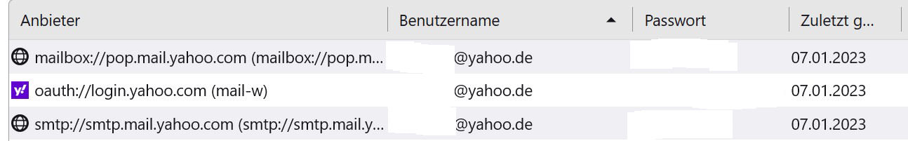 Bei den gespeicherten Passwörter fiel mir auf, daß es für das funktionierende 3 Einträge gibt (siehe Screenshot), beim nicht funktionierenden fehlt der "oauth://..." - Eintrag.
