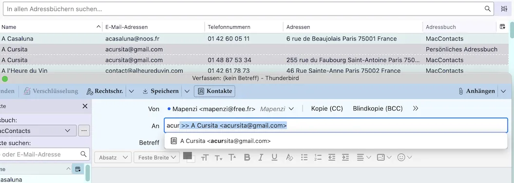Wenn man nun in einem Adresseingabefeld im Verfassenfenster einige Zeichen der Adresse eingibt werden die Einträge aus beiden Adressbüchern vorgeschlagen.
