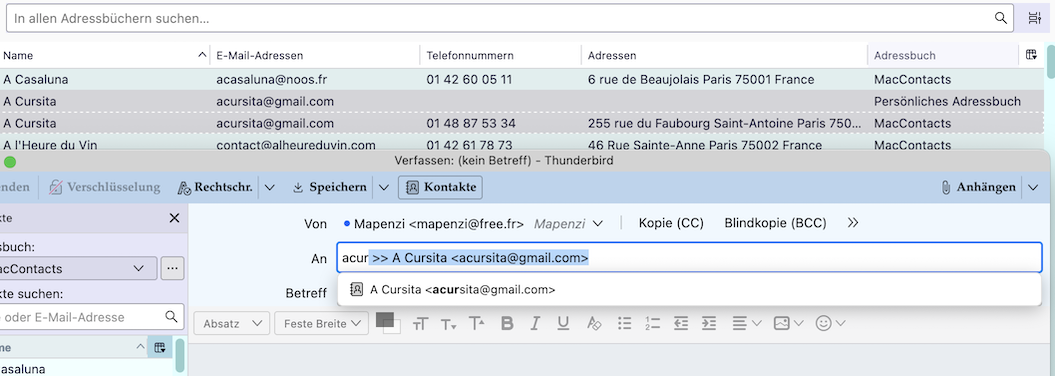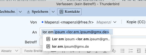Wenn man nun in einem Adresseingabefeld im Verfassenfenster einige Zeichen der Adresse eingibt werden die Einträge aus beiden Adressbüchern vorgeschlagen.