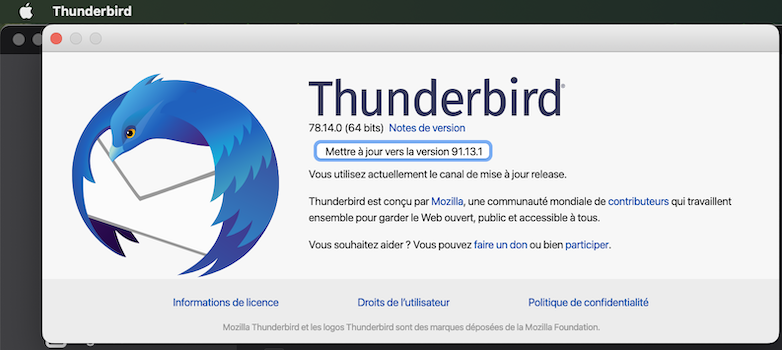 Dann über "About Thunderbird" das nächste Update angestoßen, wonach die v78.14.0 installiert und das Update auf v91.13.1 angeboten wurden.