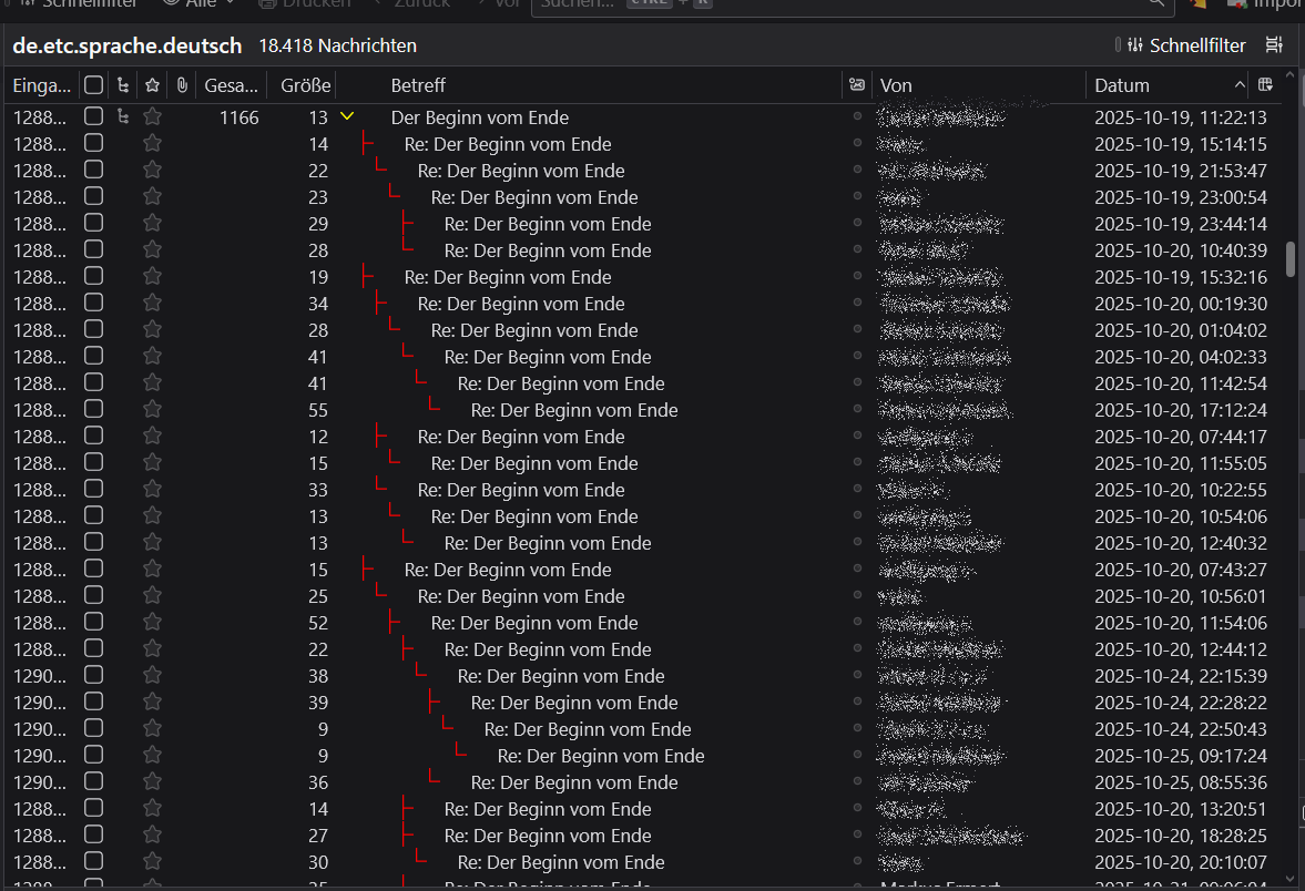 Ich persönlich finde die Gmail-Konversationsansicht bisher am besten. Alles wird sauber nach Thread sortiert, eingehende und ausgehende Mails sind direkt untereinander, man sieht schnell den Verlauf und kann mehrere Beteiligte gut überblicken. Eine interessante Idee wäre eine Graph-Ansicht, wo Mails und Antworten wie ein Netzwerkdiagramm dargestellt werden – besonders bei vielen Beteiligten wäre das übersichtlicher als eine lineare Liste.