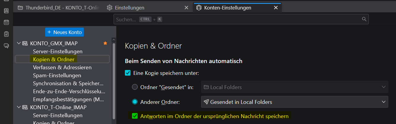 Um auch eigene Mails in der Threadansicht eines Mail-Kontos vorzufinden, bietet TB: