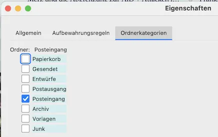 Ansonsten gibt es das Add-on "FolderFlags" https://services.addons.thunderbird.net/En-uS/thunderb…on/folderflags/ das inzwischen auch mit der v144von TB kompatibel ist. Diese Add-on erweitert das Rechtsklick > Eigenschaften Fenster eines Ordners um den Eintrag "Ordnerkategorien"