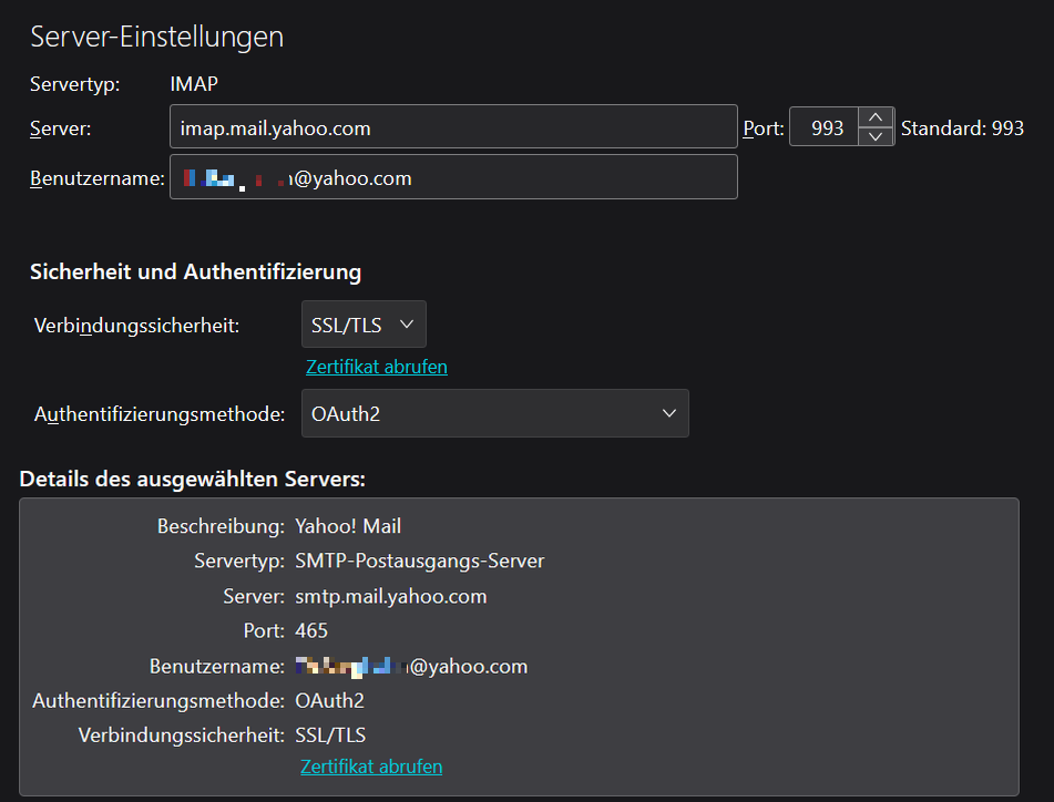 Habe gerade einen neuen Mail-Account bei yahoo! ohne Probleme mit TB 144.0.1 unter Windows11 angelegt. Alles völlig problemlos mit folgenden Daten, wobei ich bezüglich OAuth2 nichts machen musste. Auch ein App-Passwort ist entsprechend OAuth2 nicht notwendig.