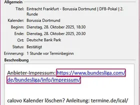 Ich habe einige Erinnerungen im Kalender des TB... u.a. solche für Fußballspiele, wie z.B. das heutige Spiel BVB : Frankfurt.