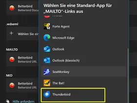 Wenn ich im Browser auf einen Email-Link klicke, öffnet sich Outlook, nicht Thunderbird. Nach Deinstallation von Outlook wird unter Standardapps Thunderbird nicht angezeigt (sondern nur Outlook, Firefox und Edge). Ich kann weitere Apps nur im "Microsoft Store" auswählen.