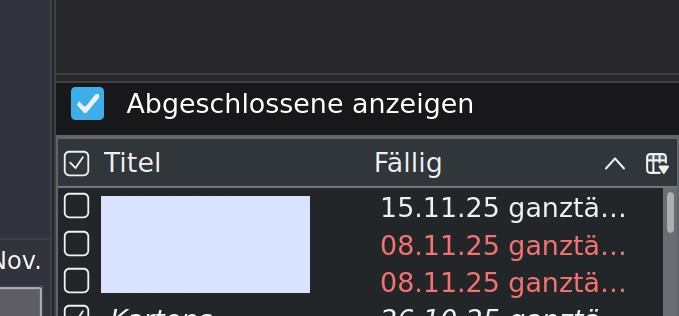 Die Sortierung der Aufgaben im kleinen Fenster rechts unten stimmt m.M.n. nicht, wie auf dem Bild zu sehen ist. Sortiert werden sollte nach Fälligkeit, so dass die zuerst fälligen Aufgaben oben stehen. Es hilft auch nichts, wenn ich mehrmals die Reihenfolge umkehre. Die beiden Aufgaben für heute (8. November) müssten eigentlich vor der Aufgabe für nächsten Samstag stehen.