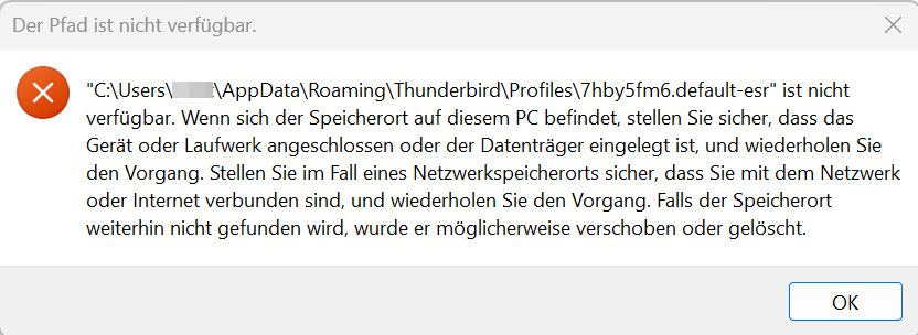 Bei den 2 angegebenen Dingen kommt bei "Ordner öffnen" (egal, wo ich den Profilordner öffnen will, gibts z.B. auch bei "Exportieren") immer die folgende Fehlermeldung (Bild), bei Punkt 2 ähnlich, Pfad bis einschl. "Thunderbird".