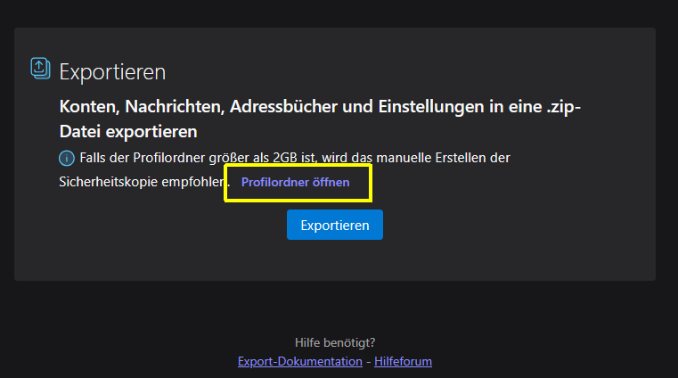 Über Werkzeuge - Exportieren konnte ich aber das Profil speichern (Zip, 1,1 GB).
