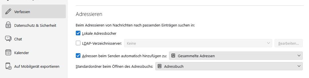 nach Neuinstallation Thunderbird mit einem Importierten Adressbuch, das vorhanden ist und angekreuzt beim Start laden, bekomme ich trotz mehrerer Einstellungen keine Adress-Vorschläge beim Schreiben einer Mail