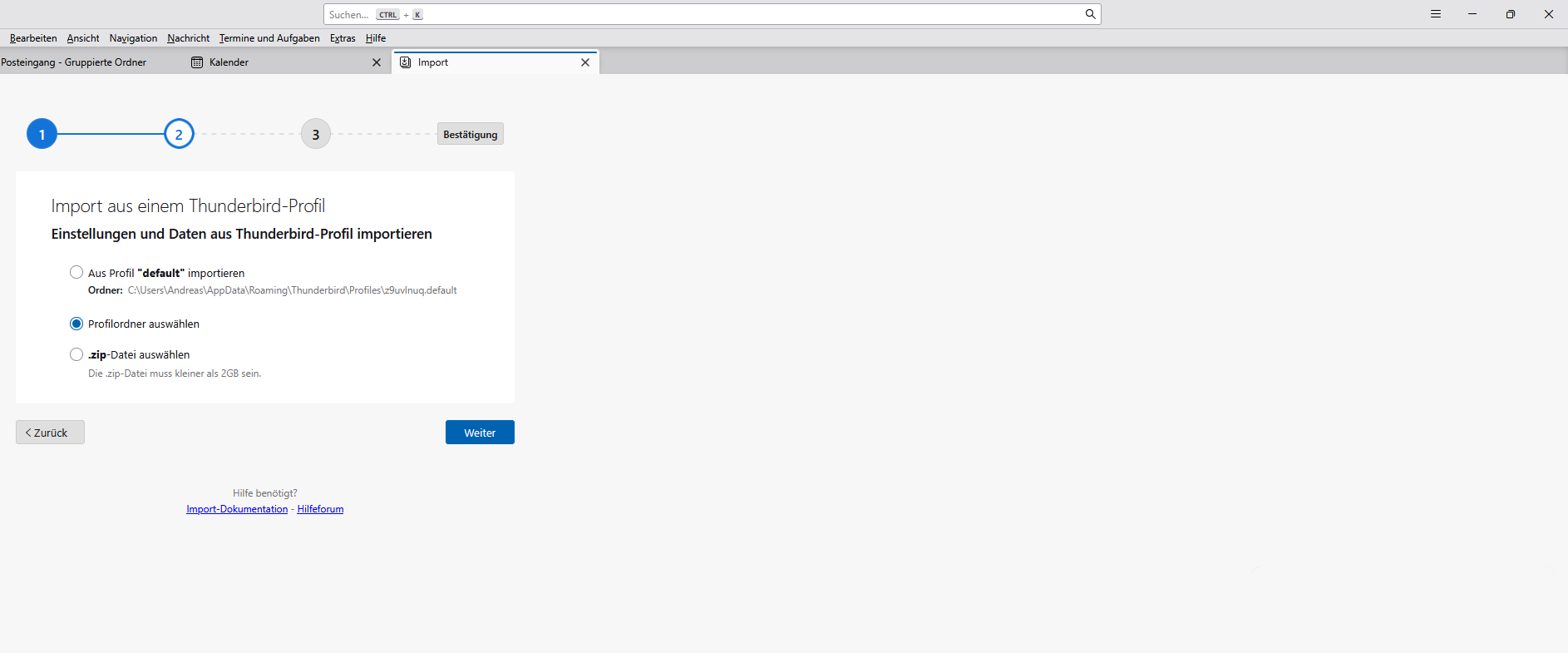 ich habe Windows inkl. Thunderbird neu installiert ohne dabei das komplette Profil einzufügen zu wollen, einzig die Kalenderdaten möchte ich einfügen, aber das klappt leider nicht. Wenn ich das so richtig verstehe hätte ich aus der alten Thunderbird-Installation raus eine Datei damit erstellen sollen die ich nun importieren könnte? Gibt es eine Möglichkeit das ohne diese datei zu machen, also wie ehemals geplant aus dem alten Profil heraus?