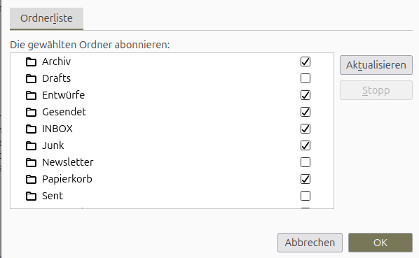 Hast du mal versucht unter Abonnieren/Ordnerliste das Häkchen bei den nicht erwünschten Ordnern zu entfernen?