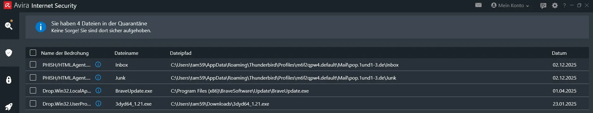 Das war - glaube ich - nicht klug. Seitdem erscheinen gar keine Dateien mehr in der Quarantäne-Auflistung...