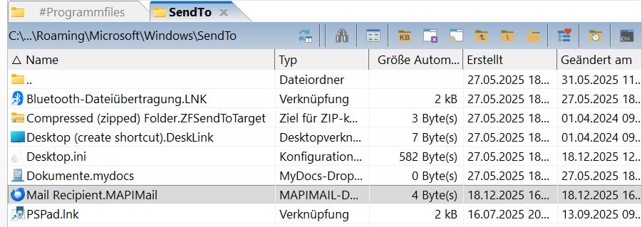 Dennoch werden beim Anklicken von rechte Maustaste / 'Senden an' keine Dateien im Mailfenster angehangen.