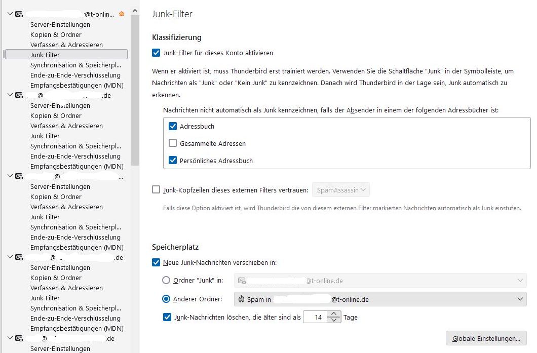 2. Spamfilter bei freenet und Junkfilter bei Thunderbird: Beide Filter prüfen eingehende E-Mails auf "Spamverdacht". Wird eine E-Mail als verdächtig eingestuft, dann wird sie in den Ordner "Spamverdacht" (freenet) oder "Junk" (Thunderbird) verschoben. Wenn Thunderbird den Ordner "Spamverdacht" von freenet richtig erkannt hat, dann verschiebt Thunderbird Junk-Mails ebenfalls in den Ordner "Spamverdacht".