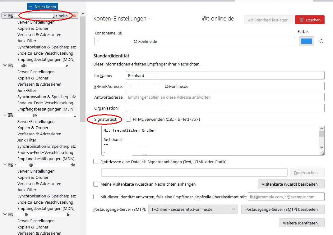 vermutlich eine öfter gestellte Frage: Ich möchte eine einfache Signatur erstellen (TB Version 143.0.1), finde das entsprechende Fenster zum Eintragen des Textes dazu (unter "Einstellungen"-->"Allgemein" müsste es doch eigentl. zu finden sein) jedoch nicht.