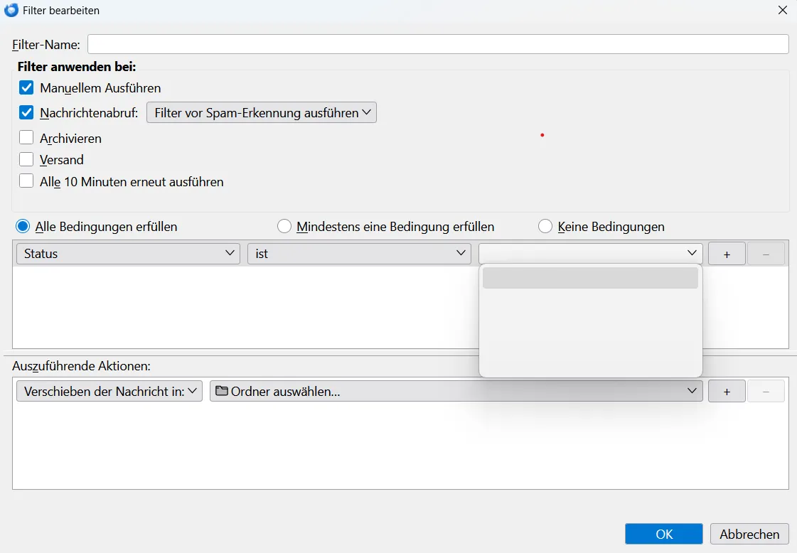wenn ich Filterregeln erstellen will sind die Dropdown Menüs bei Status und Priorität leer. Ich hatte erst Filtaquilla im Verdacht, konnte das aber bei Github mit einem sehr engagierten User ausschließen. Wo kann ich bei TB nach Fehlern suchen, alternativ, kann ich TB neu installieren ohne die Mails zu verlieren?