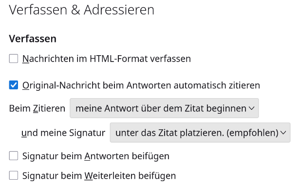ich würde gerne meine Signatur über dem Zitat einstellen, leider finde ich diese Option nicht mehr. Im Internet steht ein Pfad der in meiner Thunderbirdversion nicht mehr funktioniert. Das Menü Verfassen und Adressieren existiert nicht mehr.