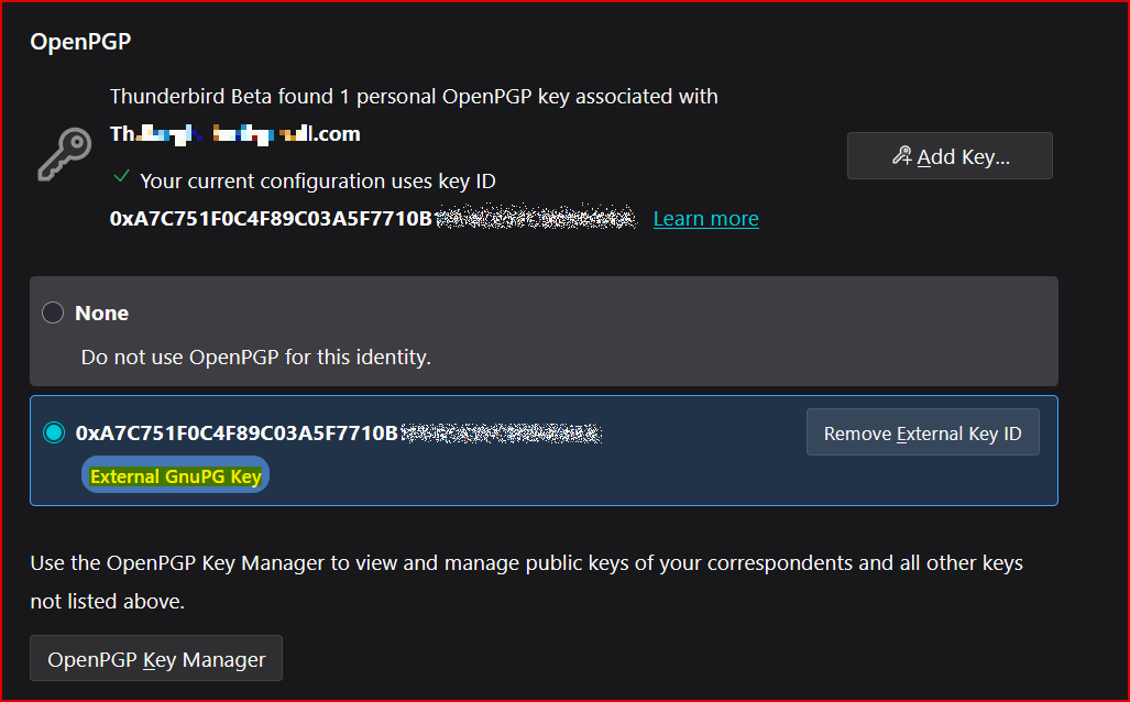 Ich habe für eine Alias Adresse ein Key pair erstellt und dort steht unter "Open Key Manager" meine Emailadresse und dann unter "Key properties":