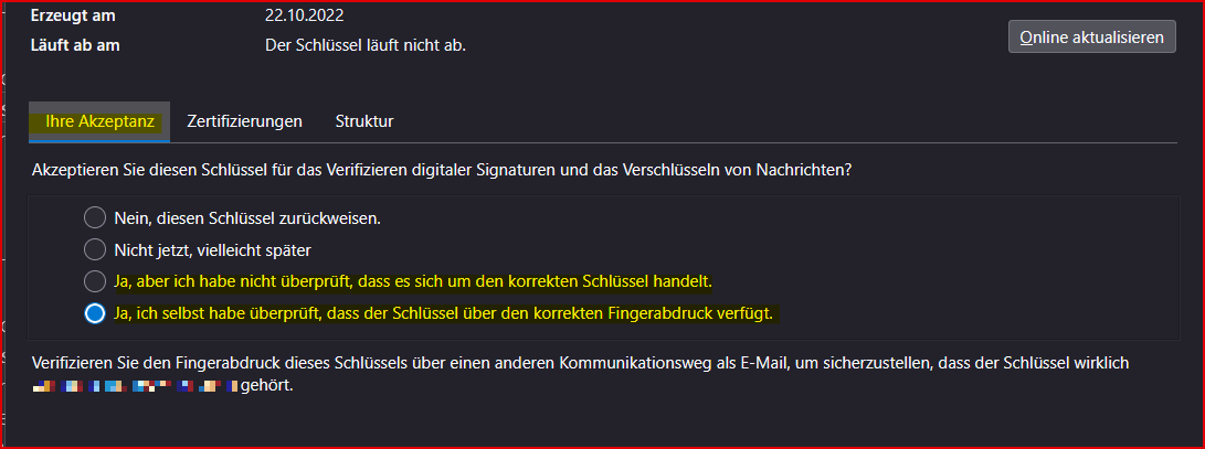 Wenn "Ja", dann klicke doppelt auf seinen Schlüssel in der Schlüsselverwaltung. Wähle im Reiter "Ihre Akzeptanz" dein Vertrauen gegenüber dem Schlüssel aus.
