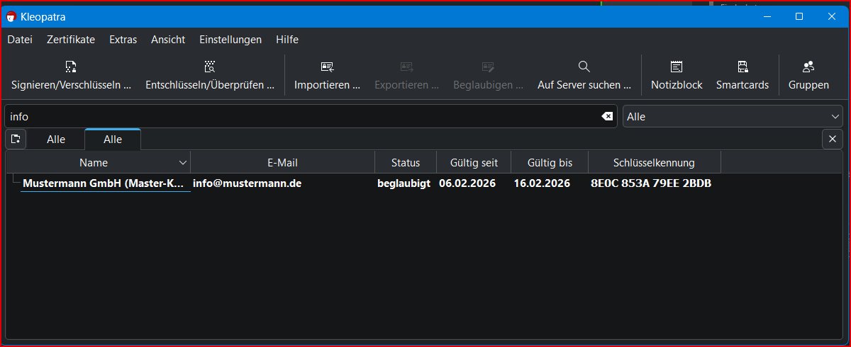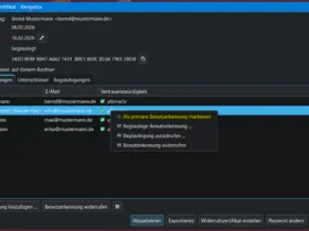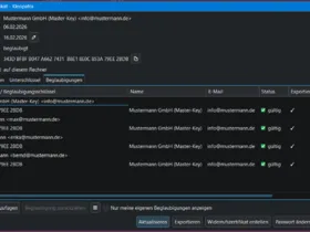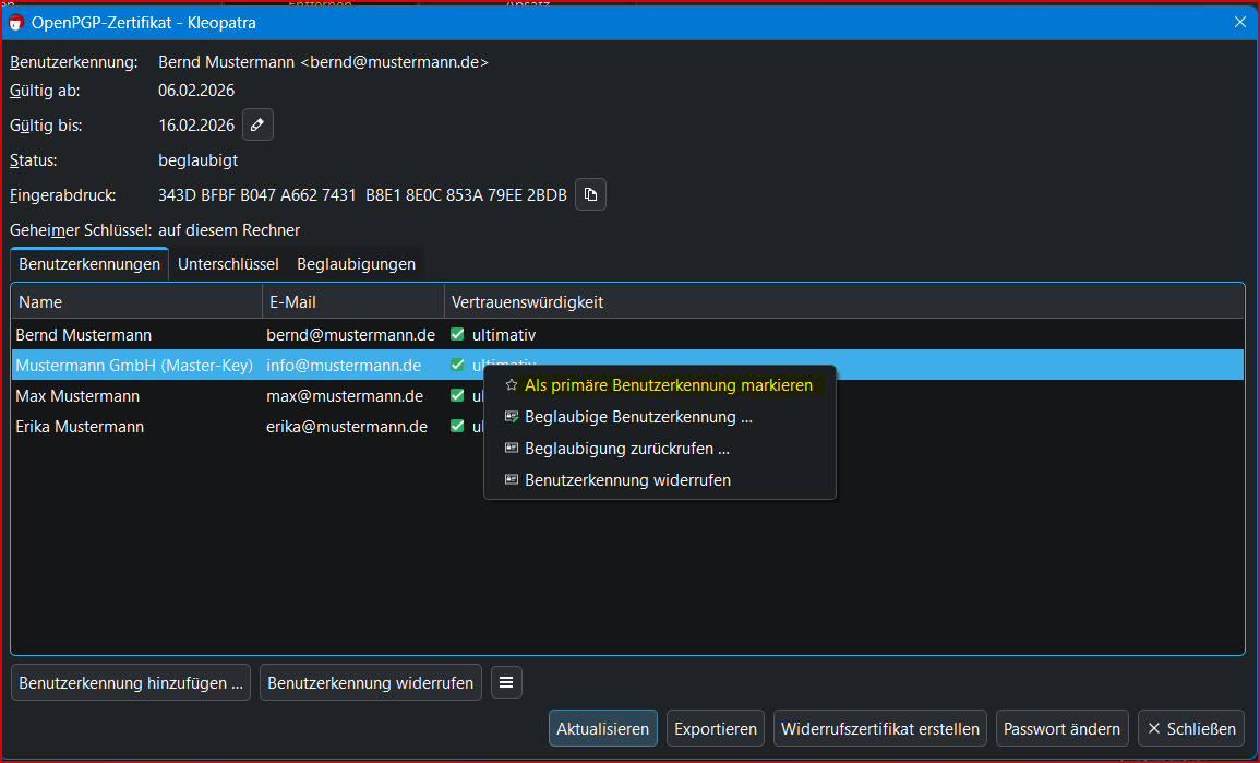 - erzeugen eines weiteren Sub-Keys (nur signieren) + UID (Name + Mail-Adresse)