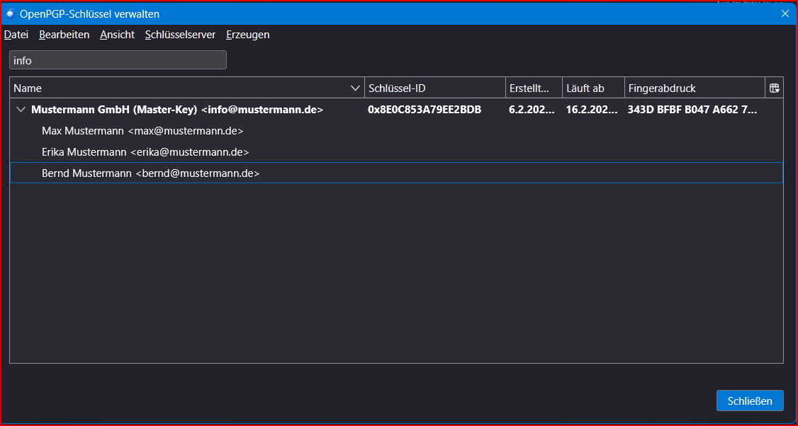 - erzeugen von x UIDs (Name + Mail-Adresse) <= all diese Adressen werden von den beiden Sub-Keys unterstützt!