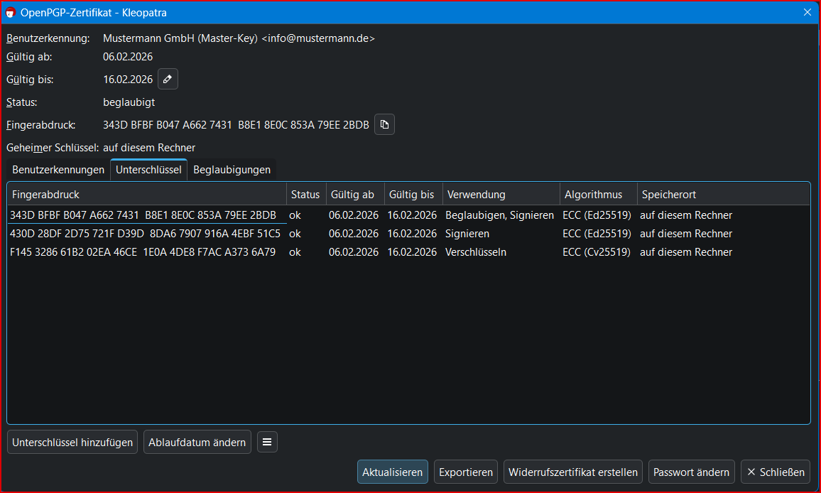 - erzeugen eines Sub-Keys (nur ver- und entschlüsseln) + UID (Name + Mail-Adresse)