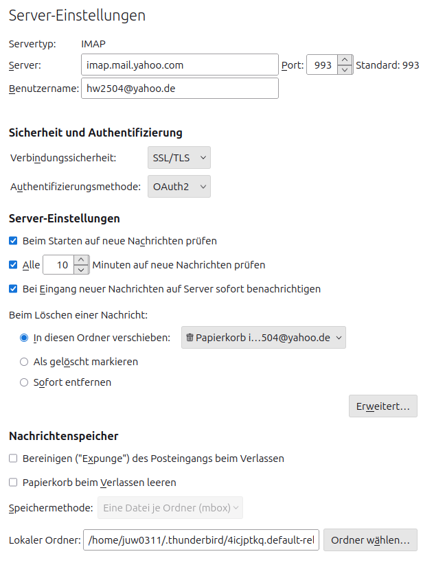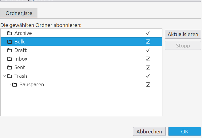 Die Ordner die bei Yahoo sind sollten alle anzeigt werden, wenn nicht stellt sich die Frage ob Du überhaupt eine Verbindung hast. LOgge dich bei Yahoo ein und prüfe die Ordner da, erstelle da gleich auch ein App-Passwort, notiere das Paßwort, zur Sicherheit falls der Server (wieder) nicht erreichbar ist.