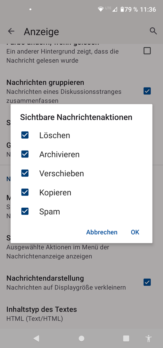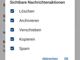 Hm, dann bin ich überfragt. Aber vielleicht geht folgendes: gehe in die Erweiterten Einstellungen/Ansicht. Ziemlich weit unten gibt es den Punkt 'Sichtbare Nachrichtenaktionen'. Dort kann man u. A. 'Verschieben' aktivieren. Die Punkte tauchen dann im Drepunktemenü der geöffneten Mails auf.