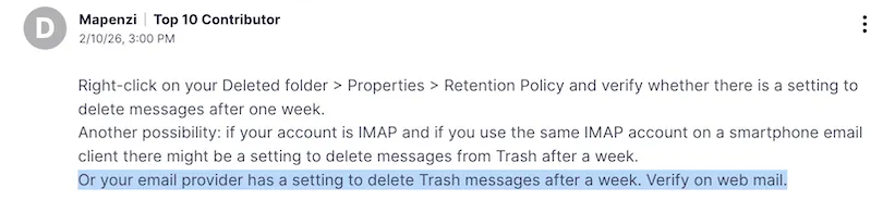 Nach einer Woche verschwinden die Mails aus dem Papierkorb.