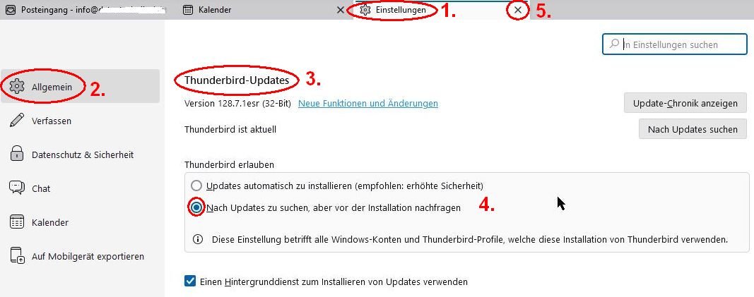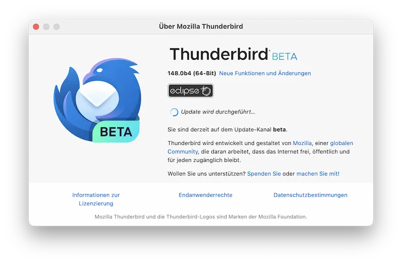 seit 3 Tagen erhalte ich ein kleines Popup, das mich auffordert Thunderbird zu schließen, damit ein Update durchgeführt werden kann. Das Popup kenne ich schon. Normalerweise erscheint nach nur wenigen Sekunden ein zweites Popup mit der Erfolgsnachricht und ich könne Thunderbird wieder starten.
