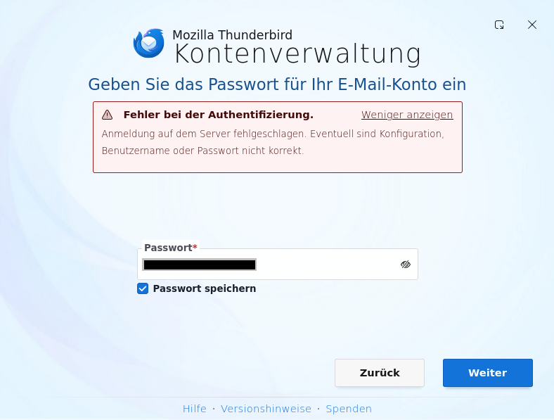 Ich habe eine E_Mail aus meinem TB versandt und wurde nach dem Kennwort gefragt. Das habe ich auch gespeichert. Beim Versuch, meine E-Mails abzurufen, werde ich nicht einmal nach dem Kennwort gefragt, sondern bekomme die Fehlermeldung aus Post #1.