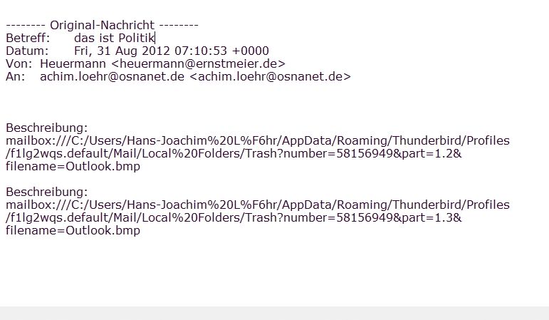 Letzteres schließe ich daraus, daß sich die Mail nicht per Markierung u. re. MT bzw. gar nicht kopieren läßt. Das habe ich auch noch nicht erlebt.