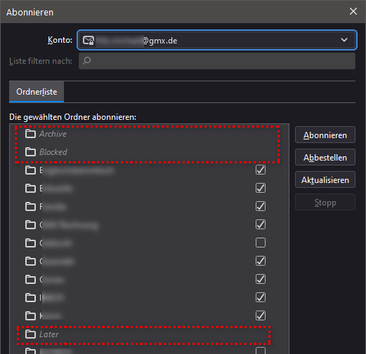 aber letztendlich sind auch nach mehrmaligem Neustart die drei Ordner verschwunden. Auch im Dialog der abonnierten Verzeichnisse sind diese nun weg.