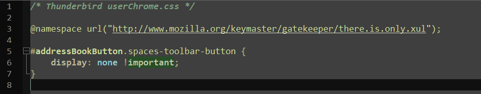 Es ist nicht nur so, dass die Namensraum-Zeile in CSS-Dateien nicht mehr üblich ist, sondern diese bei dir ist mittlerweile falsch. Früher basierten Mozilla-Produkte auf der Auszeichnungssprache XUL, daher hat auch die Namensraum-Datei bei dir die Endung .xul. Mittlerweile sind aber alle ehemaligen XUL-Dateien auf XHTML umgestellt, haben jetzt also die Endung .xhtml. Und XHTML hat einen anderen Namensraum.