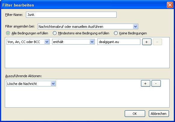 Im Fenster Filter ist die Regel für Junk angehakt, und anzuwenden auf den Ordner Posteingang.