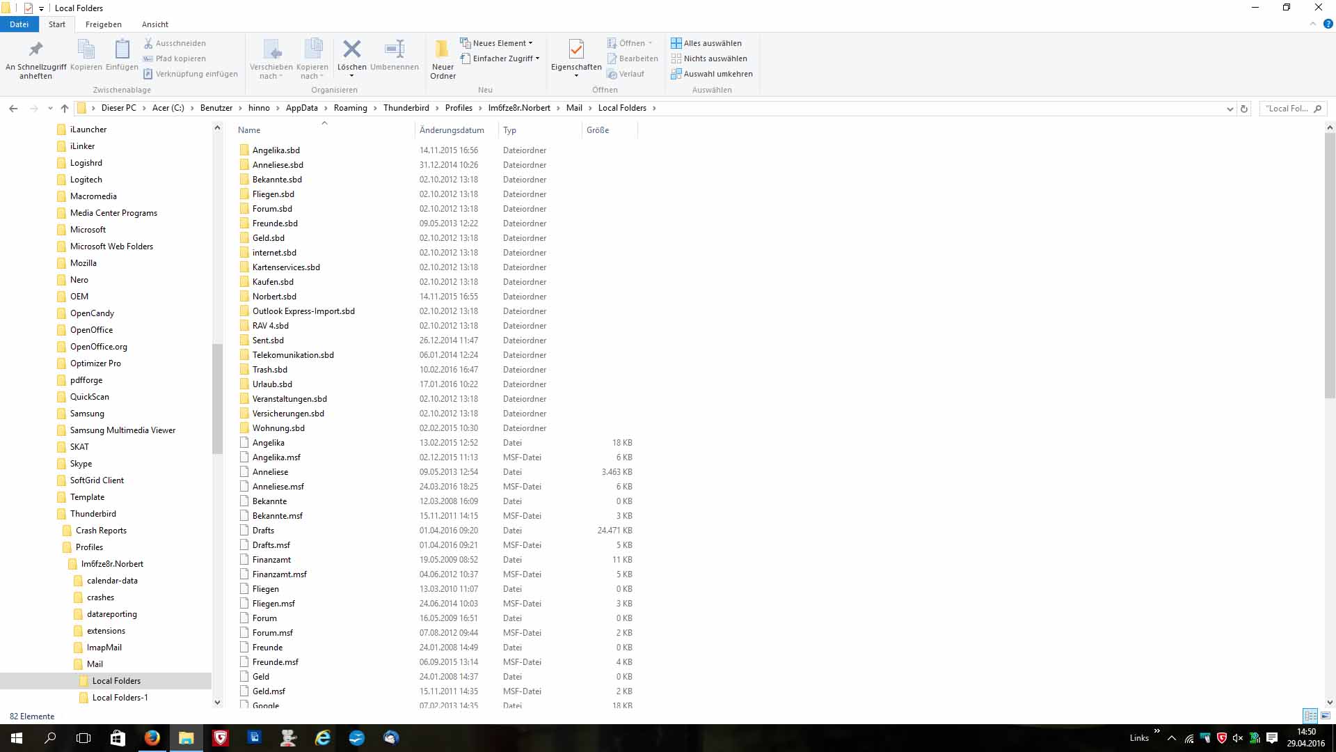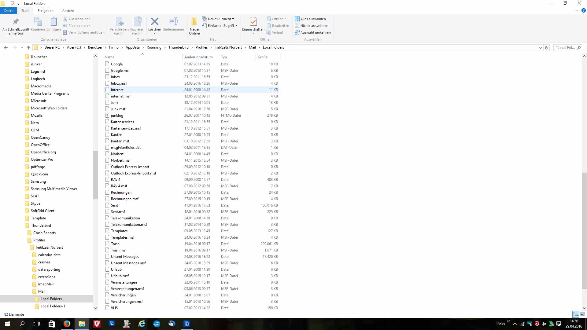 Wenn ich "Local Folders" öffne, sehe ich die Dateien Trash, Trash.msf, Unsent Messages und Unsent Messages.msf und meine alte Ordnerstruktur und Dateinamen. Die Ordner kann ich öffnen, aber nicht die Dateien, die sich hinter den Ordnern verbergen. Die Ordner sind vom Typ "Dateiordner", die Dateinamen sind vom Typ "Datei", die nächste "MSF-Datei", die folgende wieder "Datei" die nächste wieder "MSF-Datei" und so geht es weiter.