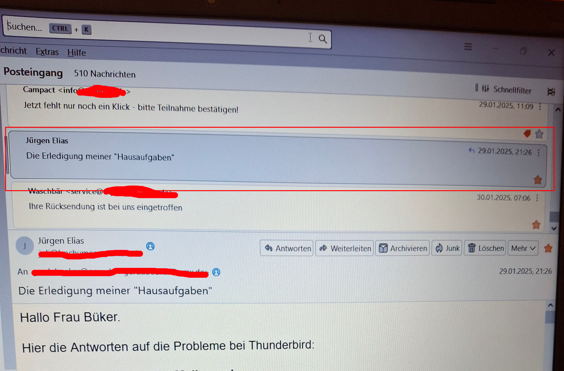 Für die Reparatur habe ich versucht, TB zu deinstallieren und neu zu installieren. Dieses funktionierte auch, doch, wenn ich das Programm öffne, wird automatisch wieder der alte Bildschirm mit den alten Mails und Ordnern angezeigt. Normalerweise wird ja nach der Installation ja das Anmeldefenster angezeigt. Das funktioniert nicht. Was kann ich tun, um TB wieder korrekt einzurichten?