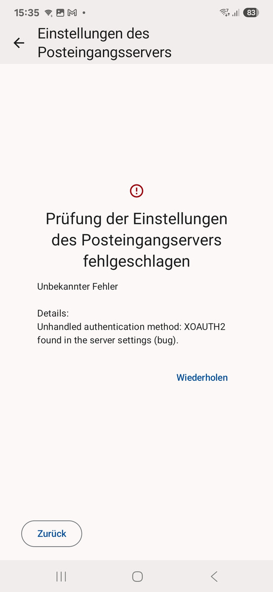 Hallo und vorab Danke für die Antworten. Ich hab das gmail Konto noch einmal gelöscht und dann neu importiert. Dann erhielt ich Die Aufforderung mich anzumelden und anschließend die Meldung , dass OAuth 2 nicht unterstützt wird.
