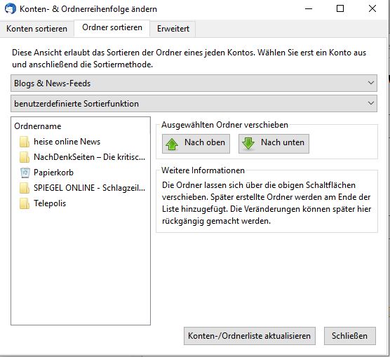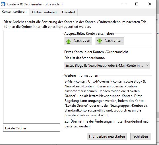 Blogs and Newsfeeds stehen bei mir unter einer langen Reihe von lokalen Ordnern, was sie aber nicht sollten. Mit dem Addon "Manually sort folders" wollte ich das gerne ändern, doch ohne Erfolg. Wenn ich nach der Installation des Addons unter "Extras ->Konten- & Ordnerreihenfolge ändern" aufrufe, erscheint nicht die komplette Aufstellung der Ordner. ![]()