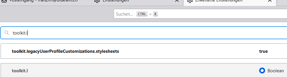 Danke dir! Habe auch einen englischen Beitrag gefunden, wo alles detailliert beschrieben ist. Allerdings habe ich früher schon mit der user.Chrome.css gearbeitet (Schrift vergrössern). Aber das hier will einfach nicht klappen? (Arbeiten mit einem portablen) . Hast du eine Idee, was ich falsch gemacht haben könnte? toolkit legacy ist auch auf true....https://www.askvg.com/tip-how-to-mov…la-thunderbird/