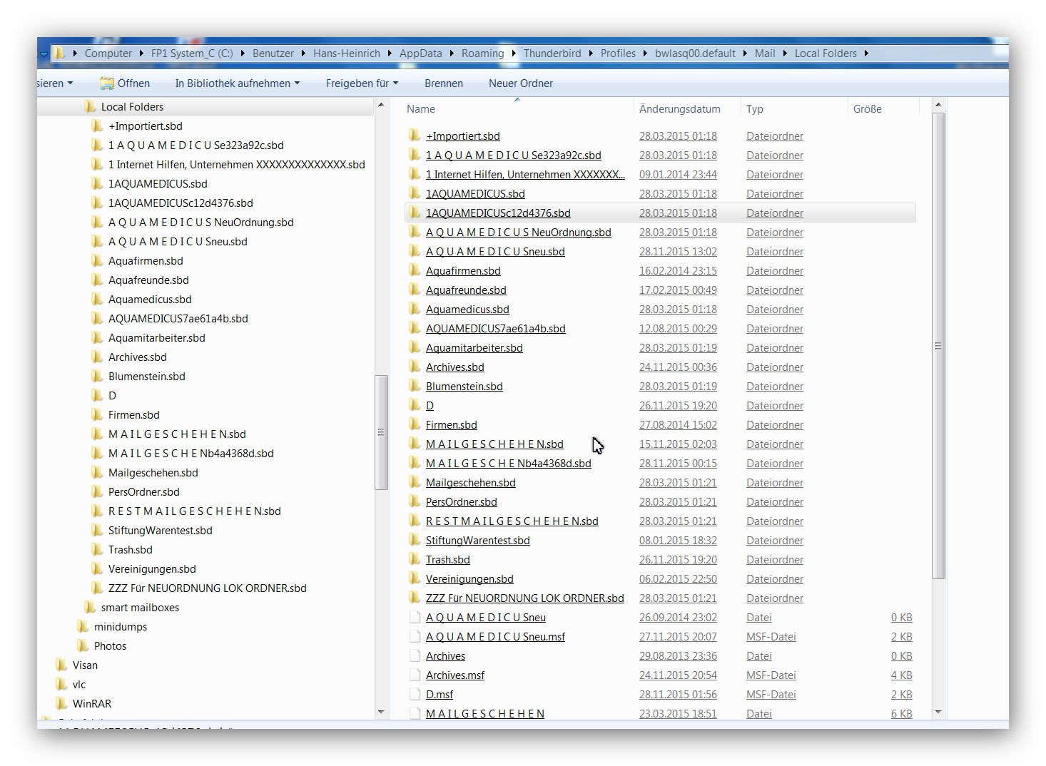 Heute öffne ich TB zur Nachprüfung einer Mail und muß voller Entsetzen wieder feststellen, daß im Lokalen Ordner nur ein Hauptordner, nämlcih der Ordner MAILGESCHEHEN vorhanden ist, und der Erste Ordner, Aquamedicus nicht mehr angezeigt wird. Einfach wieder verschwunden, nichts mehr davon wird gezeigt.Nun, nachdem ich die Tagesarbeit im Außen beendet habe, öffnete ich TB wieder, aber der Ordner bleibt weg. Dann habe ich im aktuellen Profilordner nachgesehen.