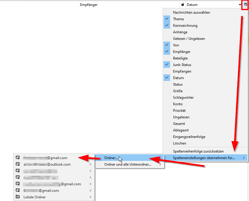 Allerdings musst Du das für jeden Ordner einzeln machen. Oder Du änderst das in einem Ordner, gehst dann auf das Zeichen neben dem Pfeil und übernimmst die Einstellungen für Deine einzelnen Mailkonten.