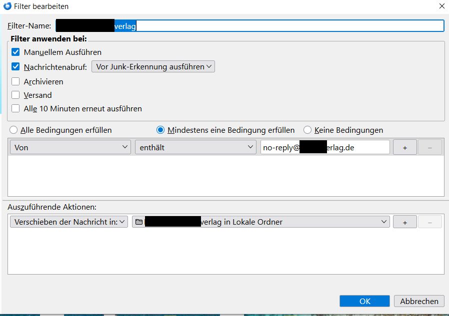 Ich nehme dann die entsprechenden Mail-Adressen unter "Bearbeiten" in die zugehörigen Filter auf, und schon bei "Jetzt ausführen" werden die Mails teilweise nicht verschoben.