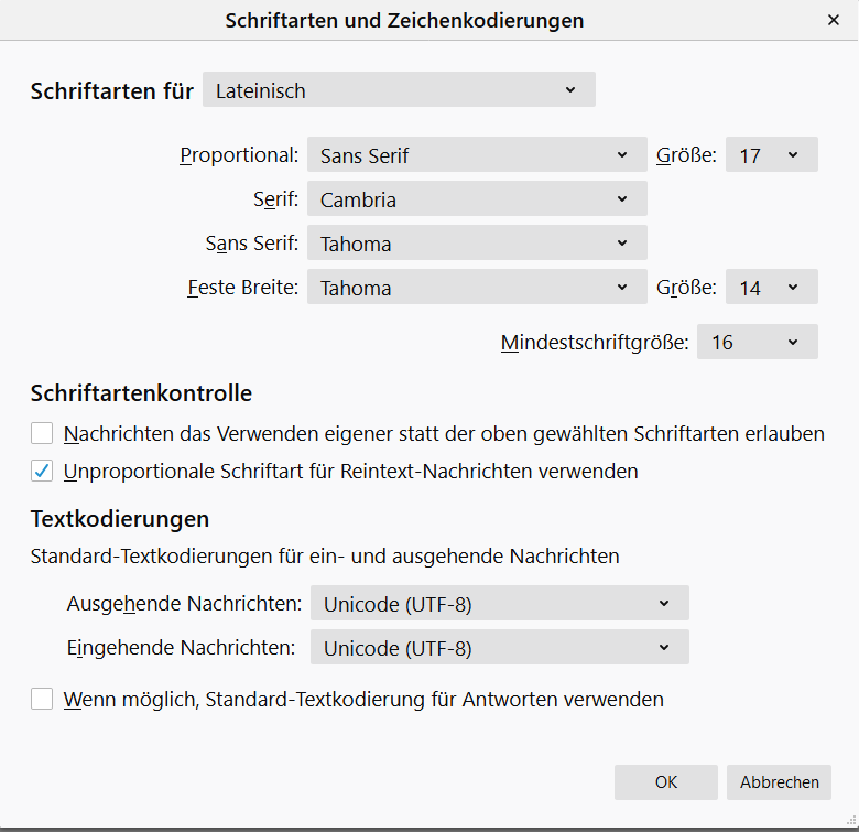 Ich hatte "unterschlagen", dass ich in dem bewussten Account (und damit dem TB-Profil) das Programm "Advanced System Font Changer" verwende, und zwar, weil ich, wenn ich wg. der zu kleinen Schriften in den Anzeigeeinstellungen generell die Größe von Text etc. auf 125 % erhöhe (das wäre eigentlich o.k. für mich) Schwierigkeiten mit der Anzeige des Desktops meines Remote Access (im Home Office) habe: