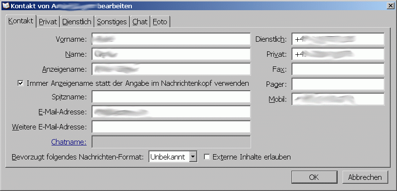 super, das ging ja schnell, vielen Dank! Ich habe alle Kontakte des Adressbuches in ein neues Adressbuch kopiert und dort dasselbe Fehlverhalten festgestellt. Das brachte mich auf die Idee, dass der Kontakt defekt ist, und so war es auch. Ein neuer Kontakt (mit identischen Daten) funktioniert einwandfrei.