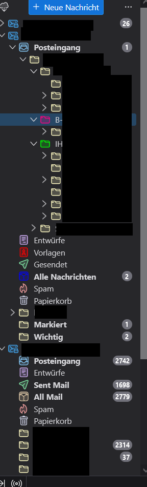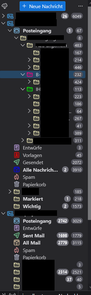 Ich arbeite mit 12 Konten und ich liebe TB von der ersten Stunde an - kein anderer eMail-Client kommt auch nur annähernd an die Vorzüge von TB heran. Aber diese Eigenmächtigkeit des Programms ärgert mich maßlos - ich bin jeden Tag dran, die Konteneinstellungen (also diese o. g. genannte Reihenfolge ...) wieder herzustellen - und das in vielen Unterordnern der einzelnen Konten, weil TB einfach manchmal über Nacht irgendwas umgeändert hat. Nicht alles, sondern nur manche (Unter-)Ordner. Und das macht mir einfach viel Arbeit.