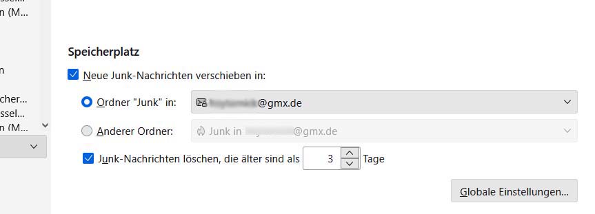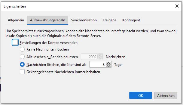 Hallo allerseits, komme gleich zur Sache: Obwohl ich in den (IMAP) Konten-Einstellungen eine Frist zum Löschen des Spams aus dem Junk-Ordner des jeweiligen Kontos eingestellt habe, wird er nicht gelöscht. Habe dann in den Eigenschaften des jeweiligen Junkordners die Aufbewahrungsregeln nach meinem Gusto geändert (hier drei Tage bis zum Löschen), aber auch da passiert nix. Hat jemand eine Erklärung, was ich da falsch mache? Anbei noch zwei selbsterklärende Screenshots.